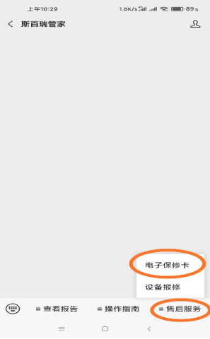 1. 先打開手機(jī)微信,添加公眾號(hào)"斯百瑞管家“,點(diǎn)擊關(guān)注。點(diǎn)擊菜單”售后服務(wù)“----電子保修卡;(圖一)