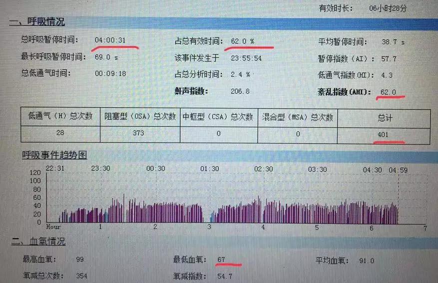 經(jīng)過醫(yī)院的睡眠監(jiān)測確定是阻塞性睡眠呼吸暫停低通氣綜合征。當(dāng)時睡眠監(jiān)測報告AHI達(dá)到62,屬于重度呼吸暫停,血氧67%,血壓160/100,有輕度的嗜睡癥狀,臉色比較蒼白,無精打采。醫(yī)生建議使用無創(chuàng)呼吸機(jī)通氣治療。