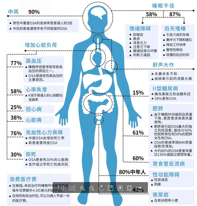 阻塞性睡眠呼吸暫停:即在睡眠中因上氣道阻塞引起呼吸暫停,表現(xiàn)為口鼻腔氣流停止而胸腹呼吸動作尚存在,是一種累及多系統(tǒng)并造成多器官損害的睡眠呼吸疾病,是高血壓、冠心病、心律失常、腦卒中等多種疾病的獨立危險因素。